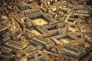 საიმპერატორო ფორუმები (მოედნის ცენტრში იმპერატორ ტრაიანეს ცხენოსანი ქანდაკება). ძველი რომის მაკეტის დეტალი. რომაული ცივილიზაციის მუზეუმი, რომი