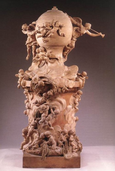 1784 წელს სამეფო კომისიის წინაშე საკონკურსოდ წარდგენილი ნამუშევარი საჰაერო ბუშტის გამოგონება, რომელიც დიდი მონუმენტისთვის ტერაკოტით შესრულებულ მოდელს წარმოადგენს, როკოკოს დიზაინის ტიპური ნიმუშია. საჰაერო ბუშტები XVIII საუკუნეში როკოკოსთვის სახასიათო სცენებით იყო მოხატული და საგულდაგულოდ მორთული ოქროს თასმებითა და ფოჩებით. ორნამენტული ზოლებით შემოვლებული კლოდიონის ბუშტი, მარცხნივ ქარის ღვთაების, მარჯვნივ კი, გამარჯვების ქალღმერთის გამოსახულებებით, სვეტისებური ფორმის გასაშვები მოწყობილობიდან, კვამლის ქულებს შორის ამოიმართება. გამარჯვების ქალღმერთი საყვირით ამცნობს ფრენის დაწყებას, ქარის ღვთაება კი სულს უბერავს და ამით თითქოს ბუშტს აფრენაში ეხმარება. რამდენიმე პუტი ბუშტში ჰაერის გასაცხელებლად ალს აღვივებს, დანარჩენები კი, ცეცხლისთვის ჩალის შეგროვებით არიან დაკავებულები.