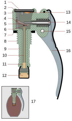 ძირითადად შედგება ორი კაფსულისაგან: კაფსულააალებადი და კაფსულა-დეტონატორი, რომლებიც განთავსებულია ლითონის ან პლასტმასის მასრაში. ამნთების დისტანციური მოქმედების ხელყუმბარაში ფალიას აქვს დენთის შემანელებელი, ხოლო დარტყმითი პრინციპის ხელყუმბარებში - კაფსულა-აალებადის ნაცვლად განთავსებულია დეტონატორები. ფალია მოქმედებაში მოჰყავთ დარტყმითი მექანიზმით.
